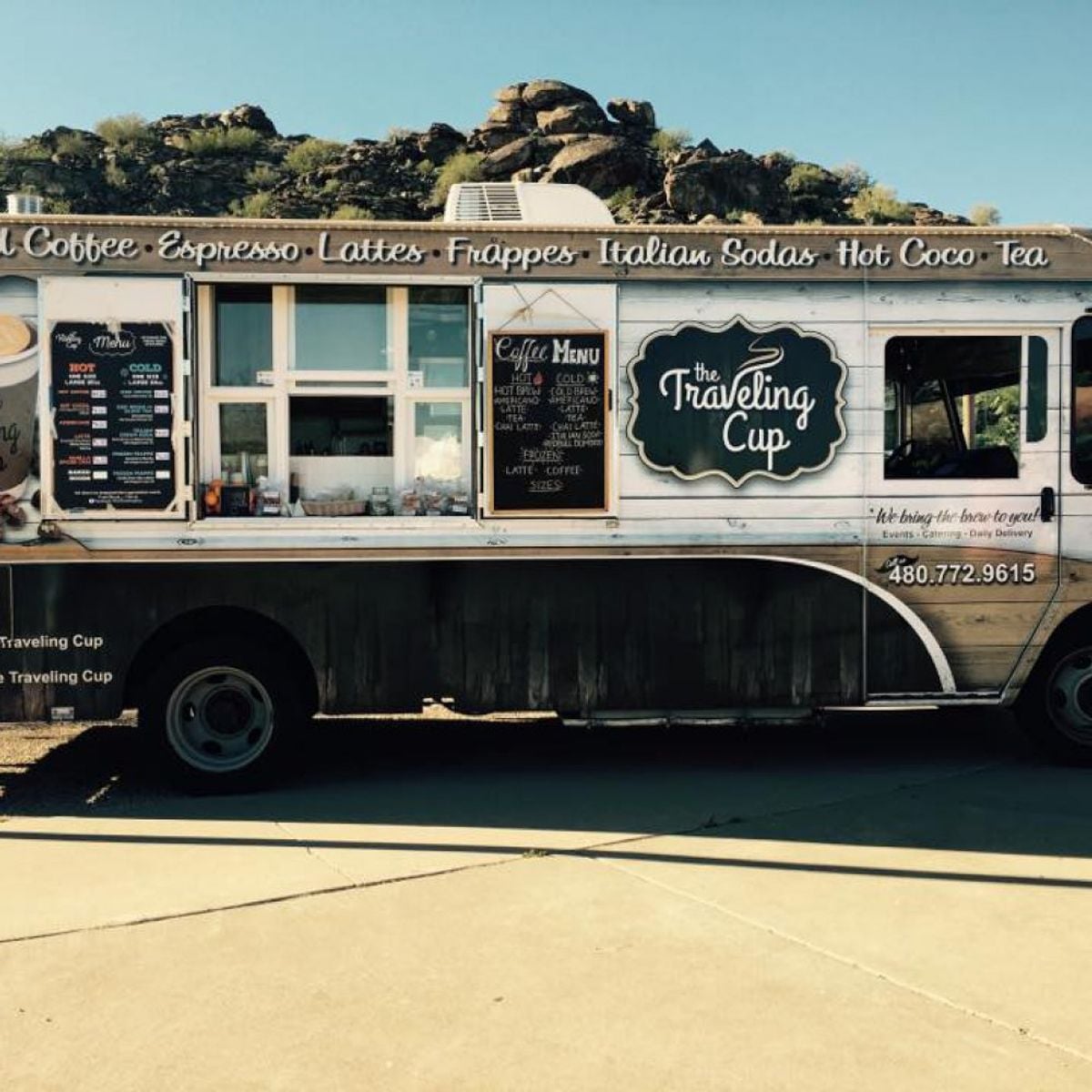 The Traveling Cup brings specialty coffee and espresso drinks to the streets of phoenix, Arizona. Check availability and book through BiteBase.