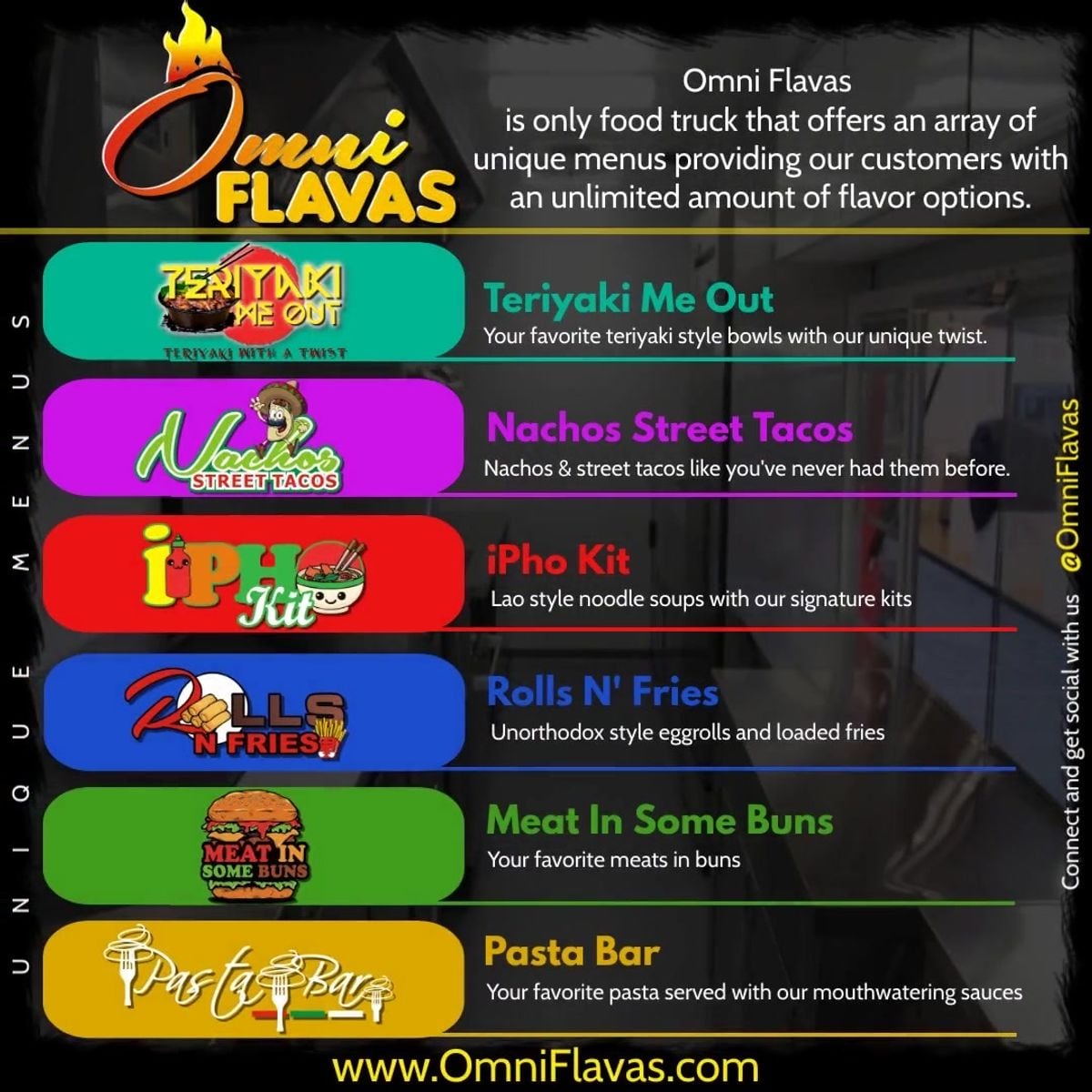 Discover the extraordinary flavors of Omni Flavas, the premier food trailer in Dacula, GA, offering a diverse array of unique menus that promise limited but exceptional tastes. With 13 different me...