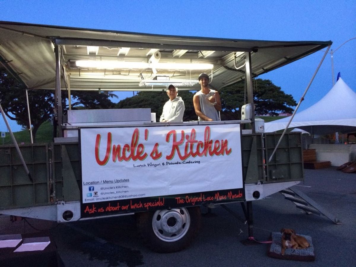 Uncle's Kitchen serving up local plate lunch with a twist! Most unique lunch wagon on Oahu. Our trailer is an old military kitchen converted into a lunch wagon.